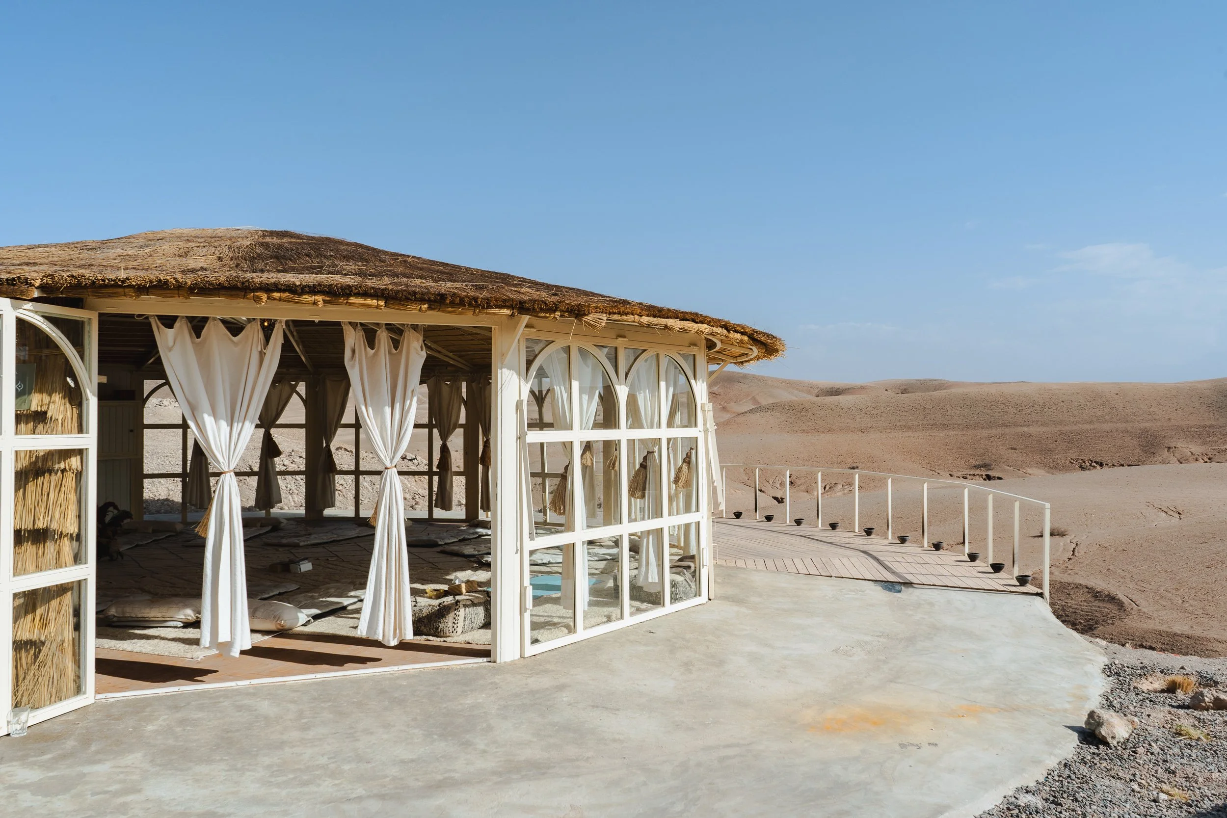 For our last two nights, we trade the lively streets for the wide-open silence of Agafay. We settle into a cosy camp with traditional berber tents, and as the sun dips below the horizon, we come together for a sunset practice unlike anything else. No noise, no city, just desert light and open sky. Raw, peaceful, and completely unforgettable.